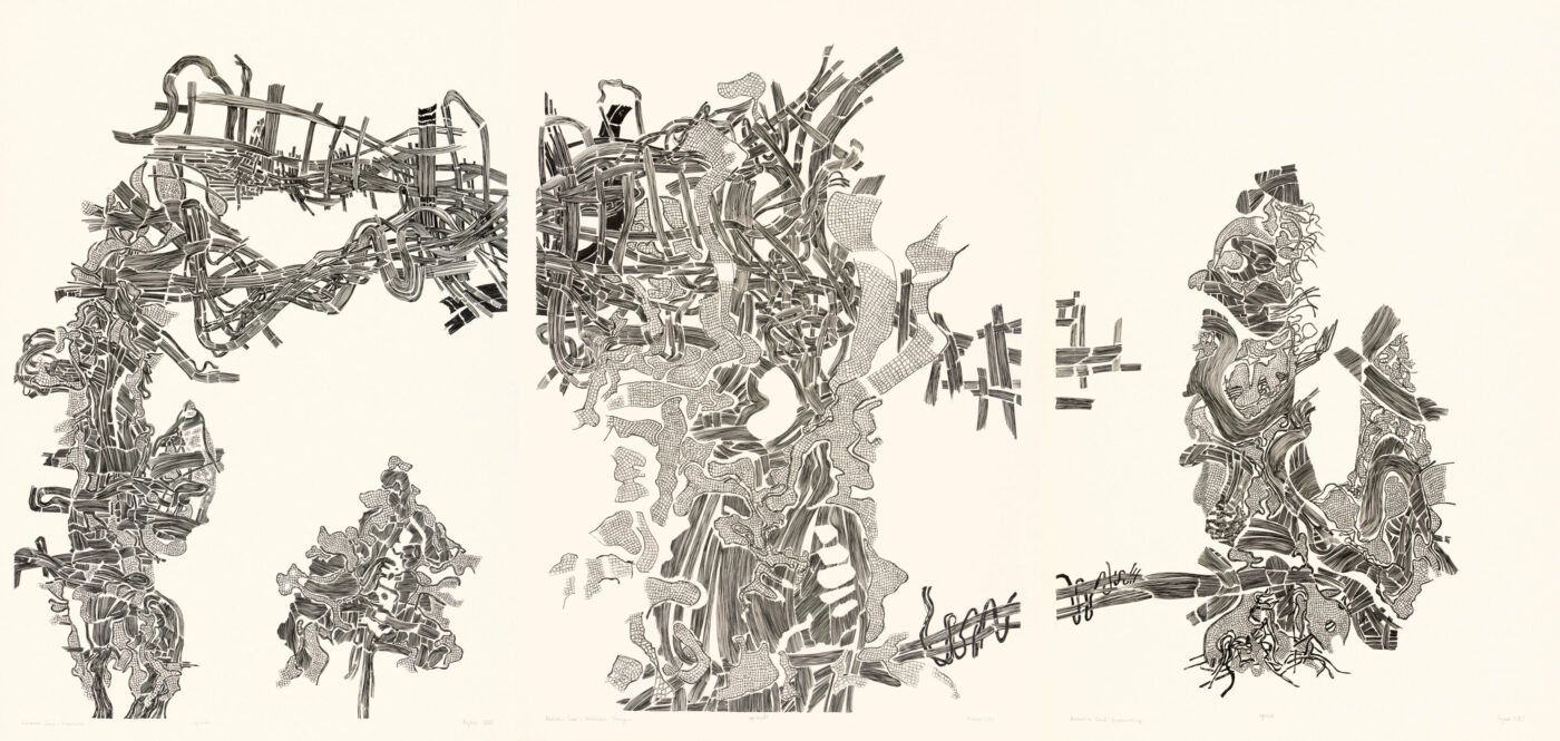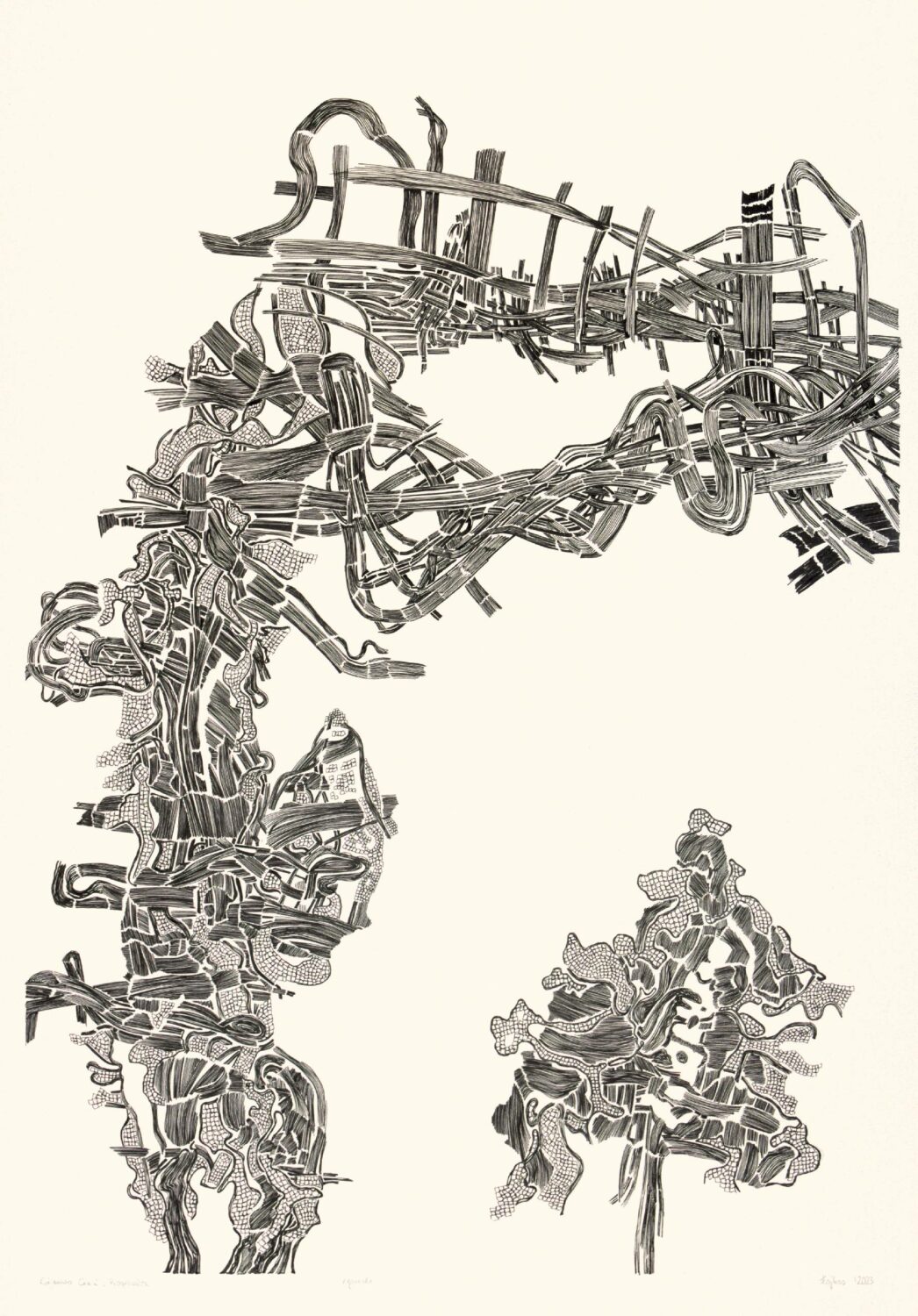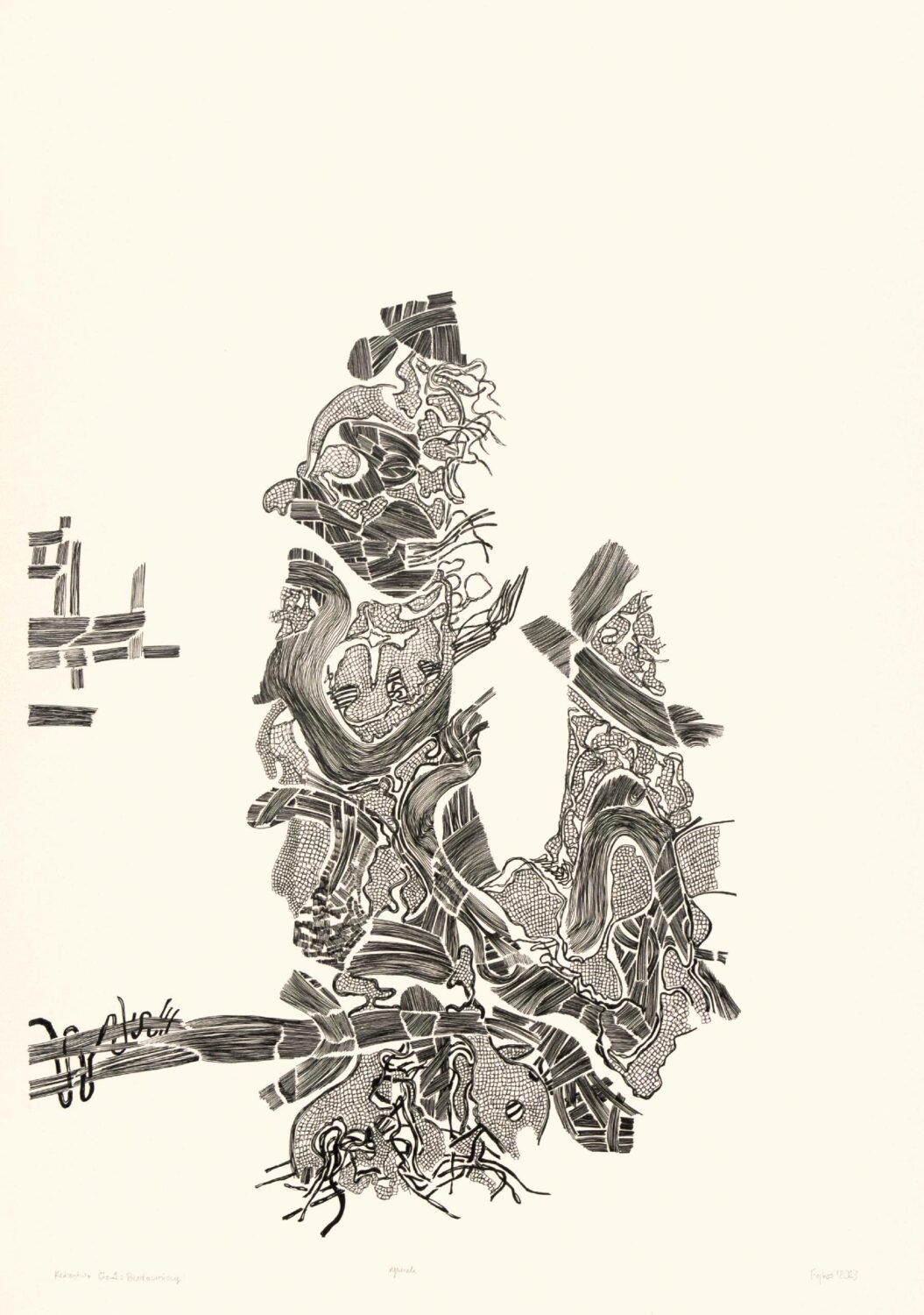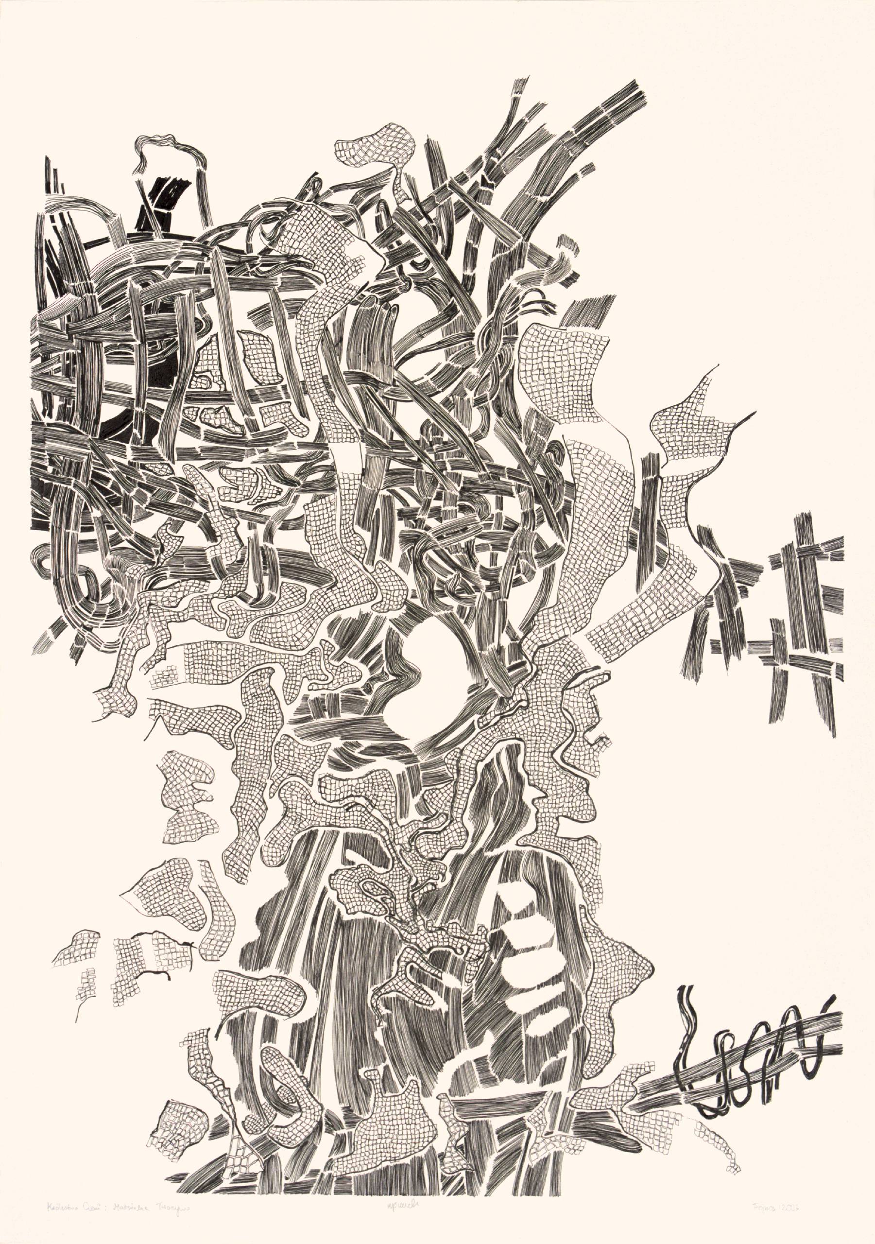 • Sebastian Skowroński „Fojbos”, Królestwo Cieni: Materialne Tworzywo, 2023, rysunek tusz, 100×70 cm, papier 300g