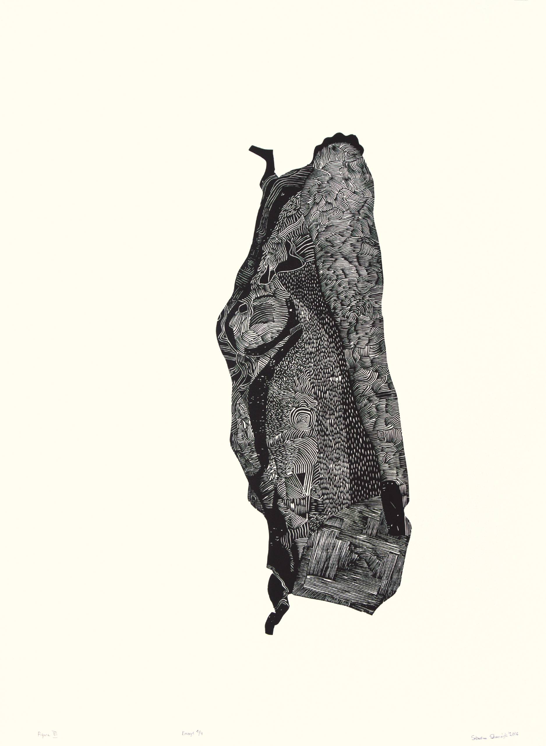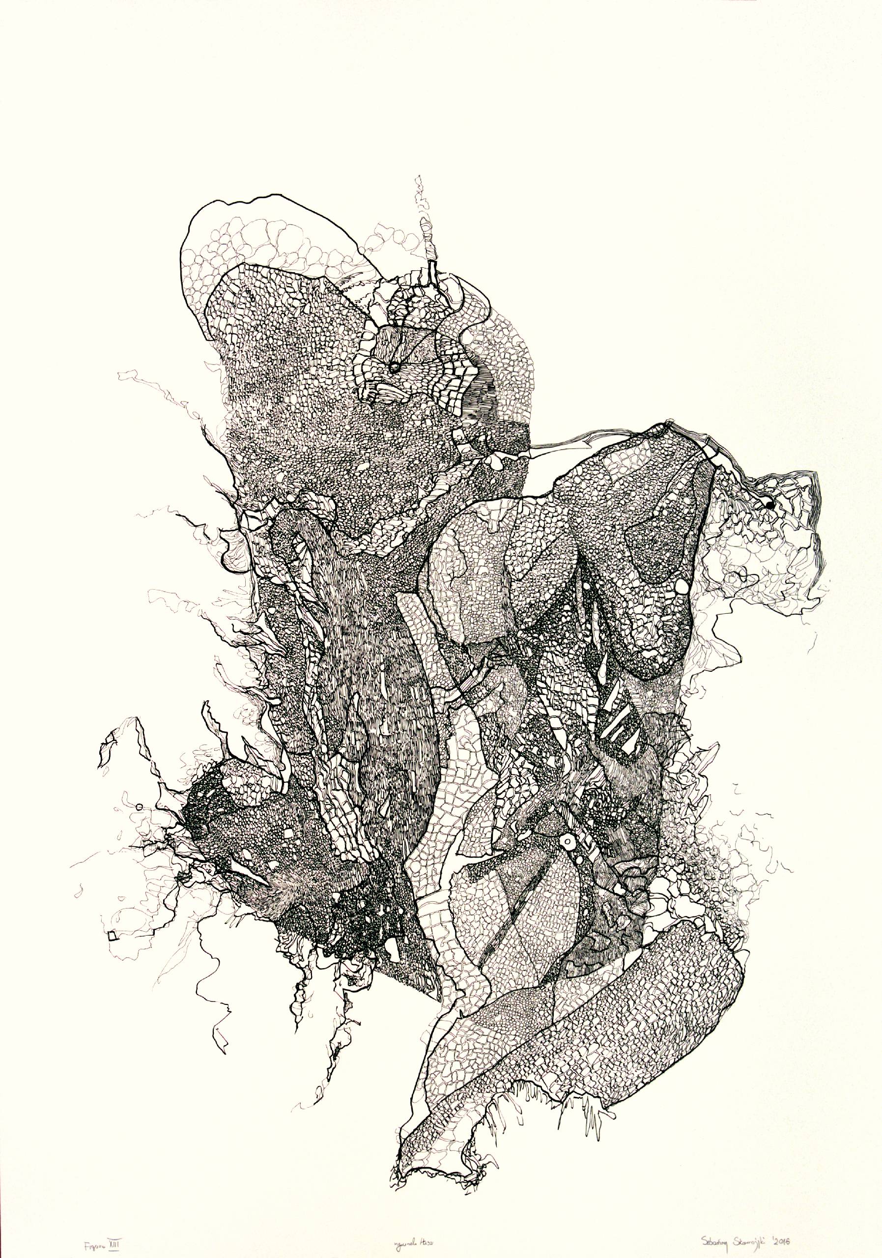 „Figura XII”, to kolejna realizacja z całego zestawu prac o tym samym tytule. W ostatnim czasie wpadłem na pomysł, aby w obrębie jednej matrycy wykonywać nakład kilku sztuk i do każdej z osobna dodawać rysunek, co różnicowałoby te prace. Każda praca będzie wówczas unikatowa, z identyczną grafiką, ale inaczej wykończona. Natomiast jedną z nich, w tym przypadku pierwszą z nakładu 4 sztuk, będę pozostawiał jako „czystą” grafikę, nie poszerzaną o inne techniki. Poza tym, gdyby pojawiła się taka potrzeba, mogę wykonać jeszcze tzw. odbitkę autorską.