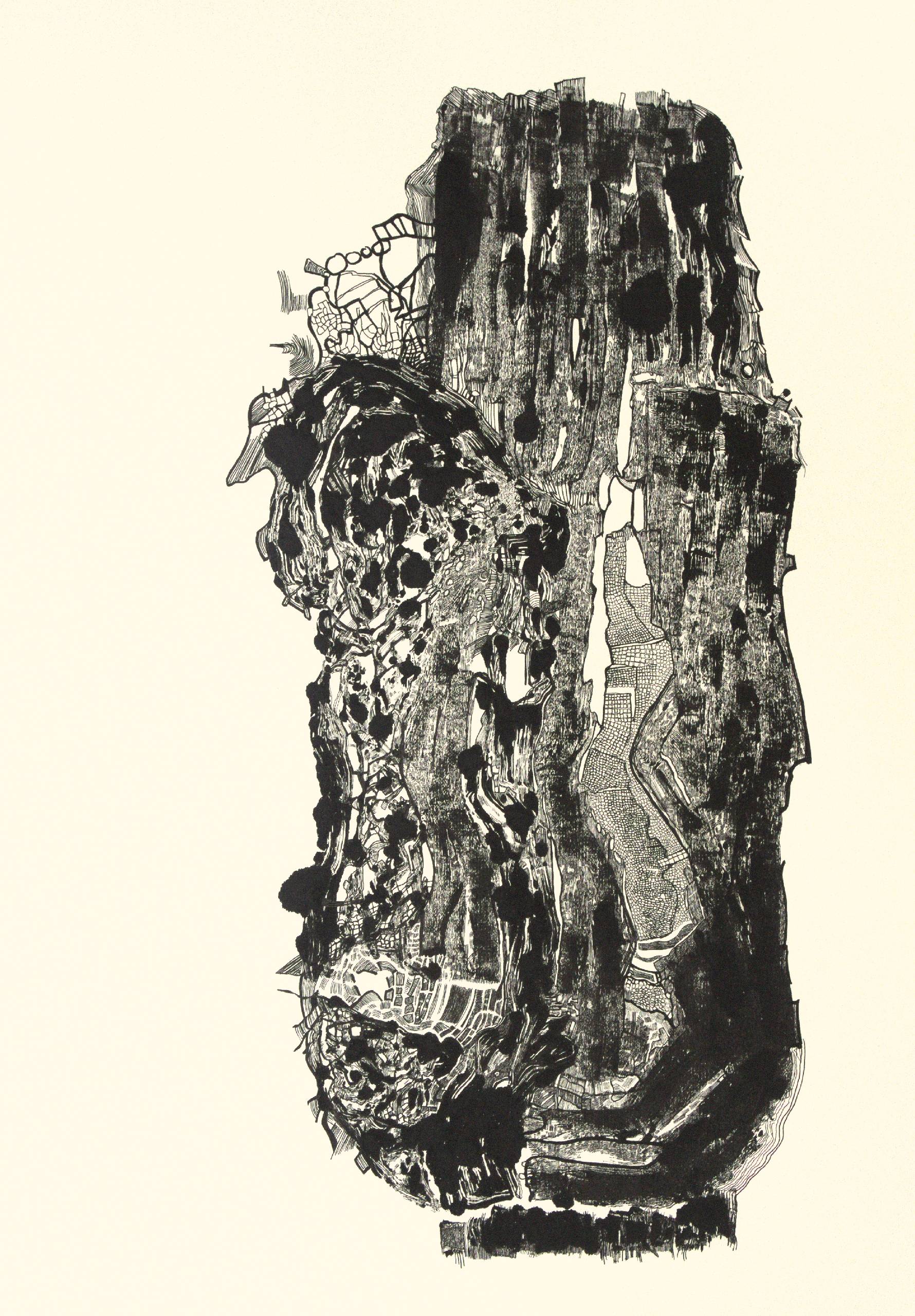 Sebastian Skowroński „Fojbos”, Cabin, 2023, technika własna, monotypia tusz kalkograficzny, rysunek tusz indyjski, 100×70 cm, papier 300g