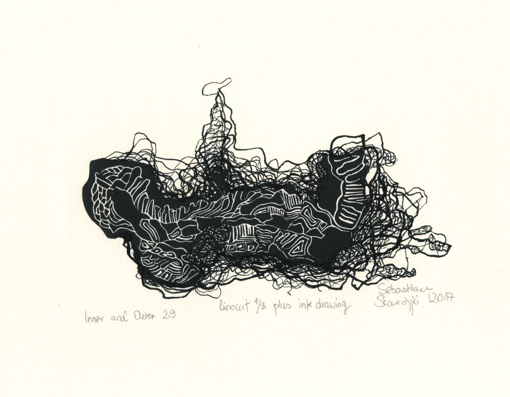 Sebastian Skowroński, Inner and Outer 31, 2017, linoryt, 15×7,5cm, odbitka unikatowa 1/1, papier Hahnemuhle 230g (24x16cm)