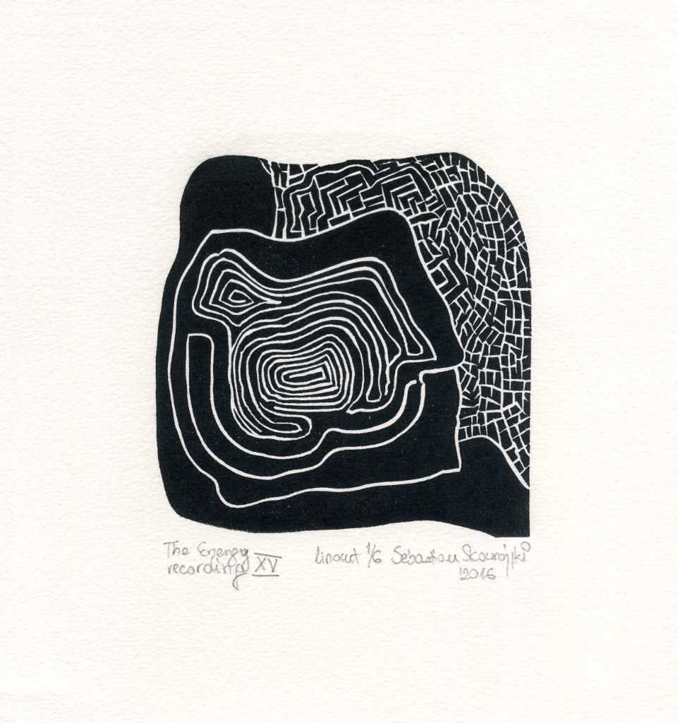 Sebastian Skowroński, The Energy recording XVI, 2016, linoryt, 10x10cm, rycina 1/6, papier Hahnemuhle 230g